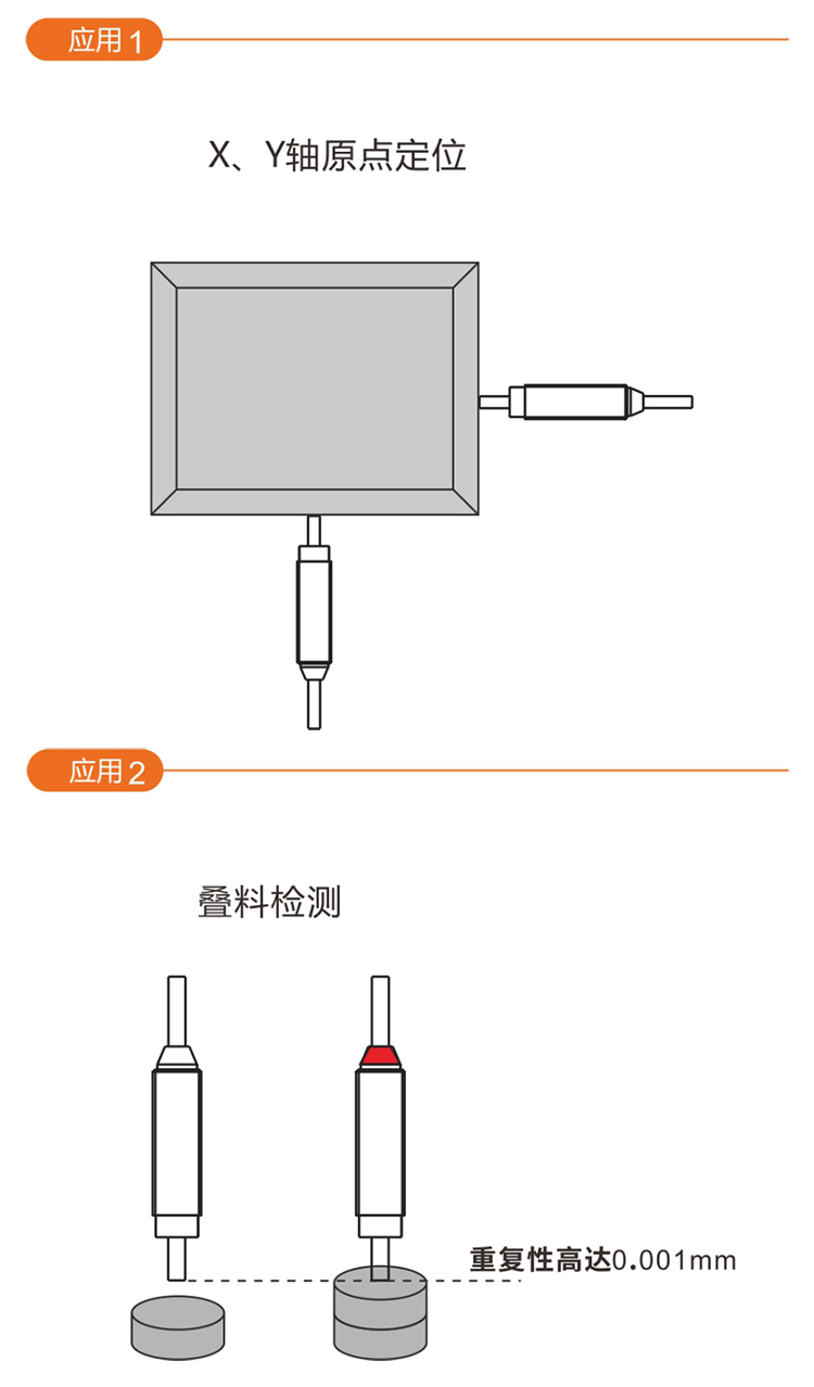 如X\Y軸定位,在物體運動的X/Y軸上安裝該傳感器,當(dāng)物體朝軸方向運動,按壓到傳感器后在觸發(fā)信號的位置輸出信號,再控制物體停止或做其他動作。