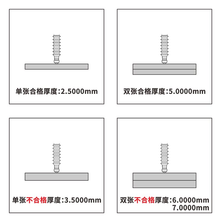 在檢測來料厚度時,合格料的厚度大概為2.5mm,不合格料大概為3.5mm,誤差不超過0.1mm,精度要求不高,而ECOTTER接觸位移傳感器的檢測精度可以達(dá)到0.5um,并且支持動態(tài)測量。設(shè)定合格尺寸2.5±0.1mm、5.0±0.1mm,不合格尺寸3.5±0.1、6.0±0.1mm、7.0±0.1mm實(shí)現(xiàn)剔除。