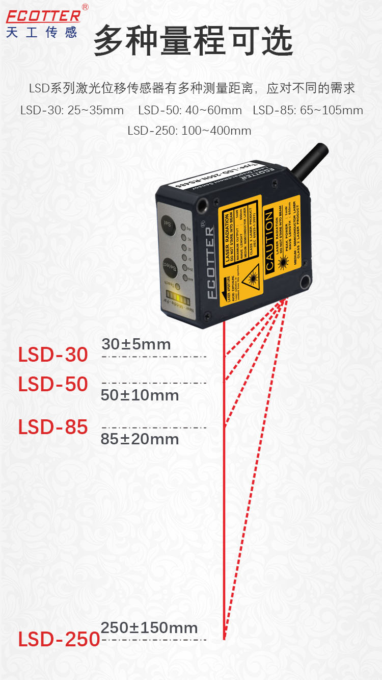 ECOTTER LSD系列 采用三角測(cè)量原理,激光束照射被測(cè)物體表面,反射光由接收透鏡聚焦到光敏元件。物體位移變化導(dǎo)致反射光斑位置移動(dòng),通過(guò)計(jì)算光斑位移量確定物體距離。