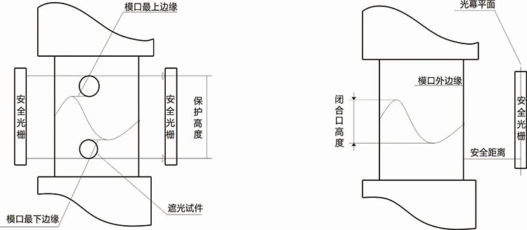 高度設(shè)定:光幕高度位置的設(shè)定,應(yīng)使安全光幕的保護(hù)高度覆蓋整個(gè)閉合??冢⒃诰嚅]口袋最上邊緣和最下邊緣,各留出至少一個(gè)遮光試件直徑值的余量。