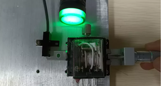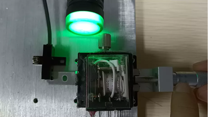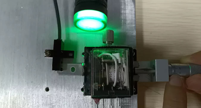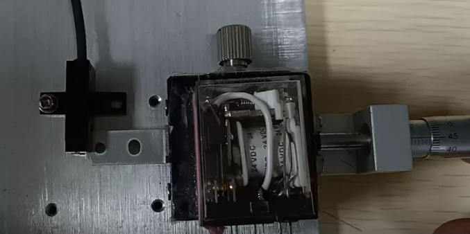 這里有一個重復(fù)精度測試儀器,我們可以通過旋動標(biāo)尺推動另一端的物塊前進(jìn),直到傳感器發(fā)出信號,此時我們記錄下這個標(biāo)尺的位置。